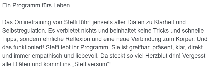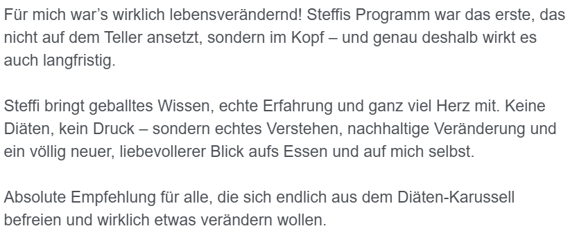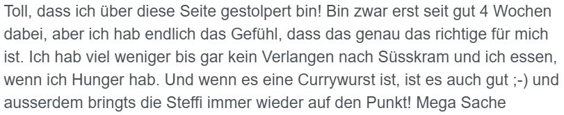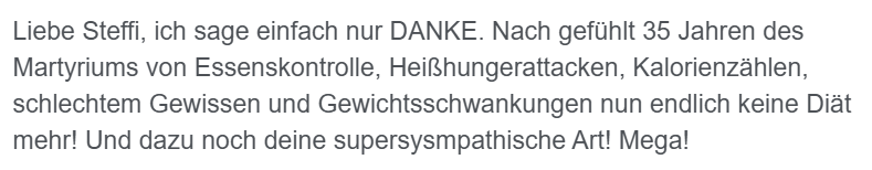 Ich habe endlich verstanden, wie natürlich schlanke Menschen wirklich ticken, welches Essverhalten sie leben , warum sie aufhören, ohne sich zwingen zu müssen, wie Genuss leicht geht und wie Essen zur schönsten Nebensache der Welt werden kann.