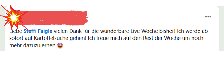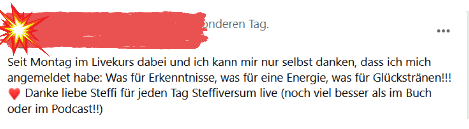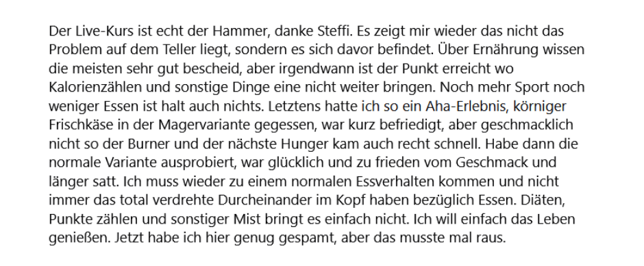 Ich hab meine ganzen Schlank-Blockaden gefunden und aufgelöst. Und glaub mir, das waren ultraviele. Krass, was ich die ganzen Jahre mit mir rumgeschleppt hab! Klar, dass das alles gar nicht funktionieren konnte. Weil’s halt auch so überhaupt nix mit Essen zu tun hatte. Heute esse ich alles und so viel wie ich will und nehm nicht zu.